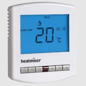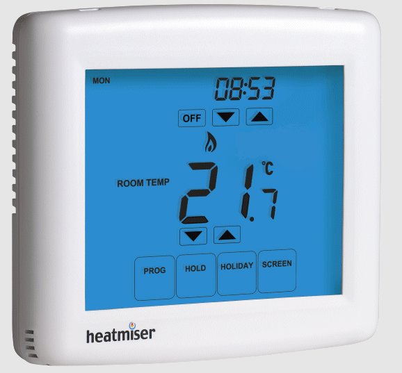 De Heatmiser PRT-NTS is een programmeerbare kamerthermostaat voor 12 V die compatibel is met netwerkproducten en het UH1-installatiecentrum.